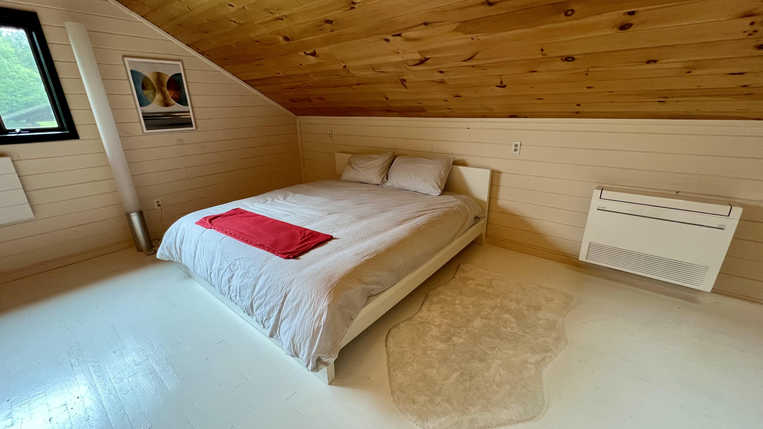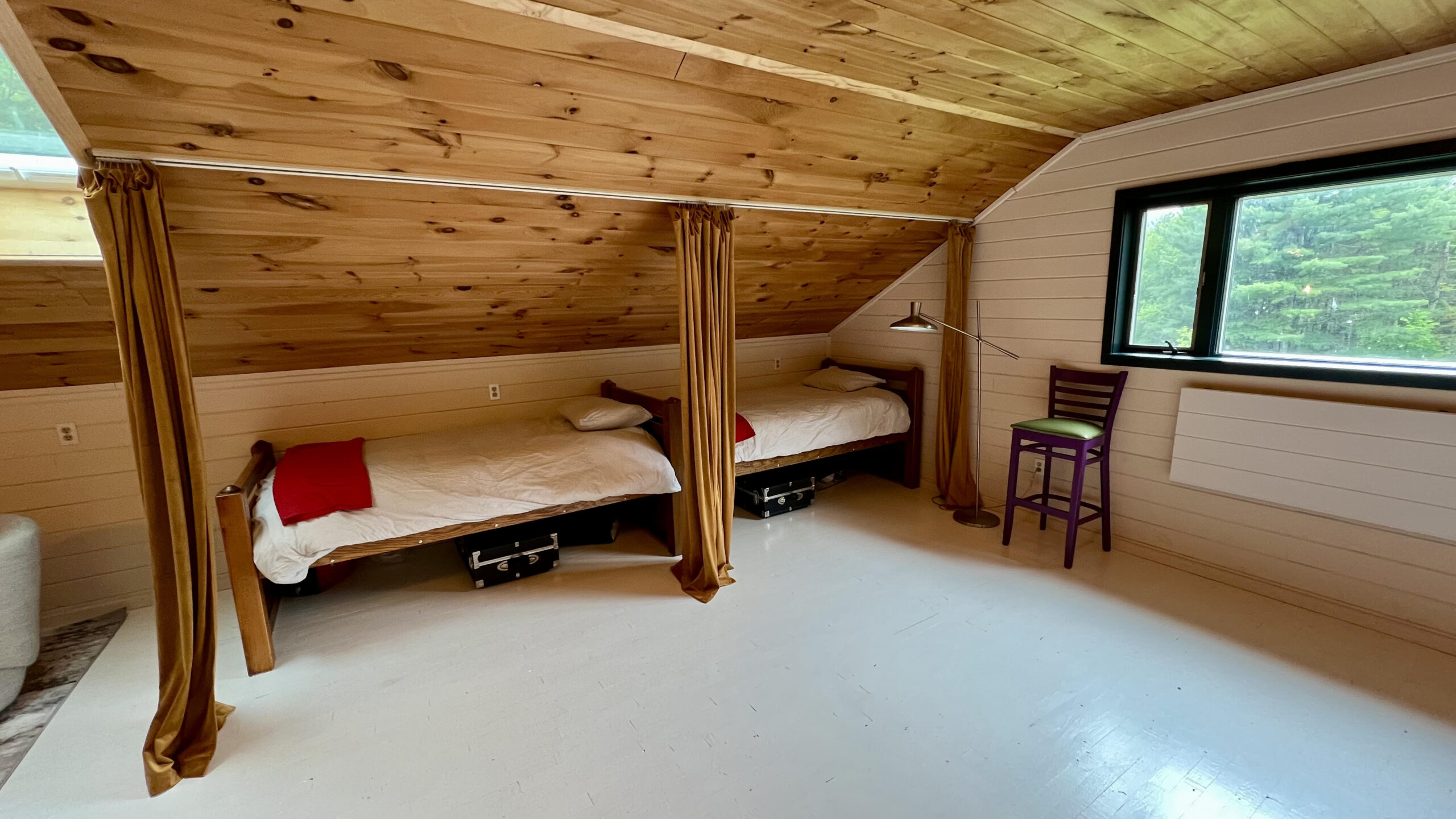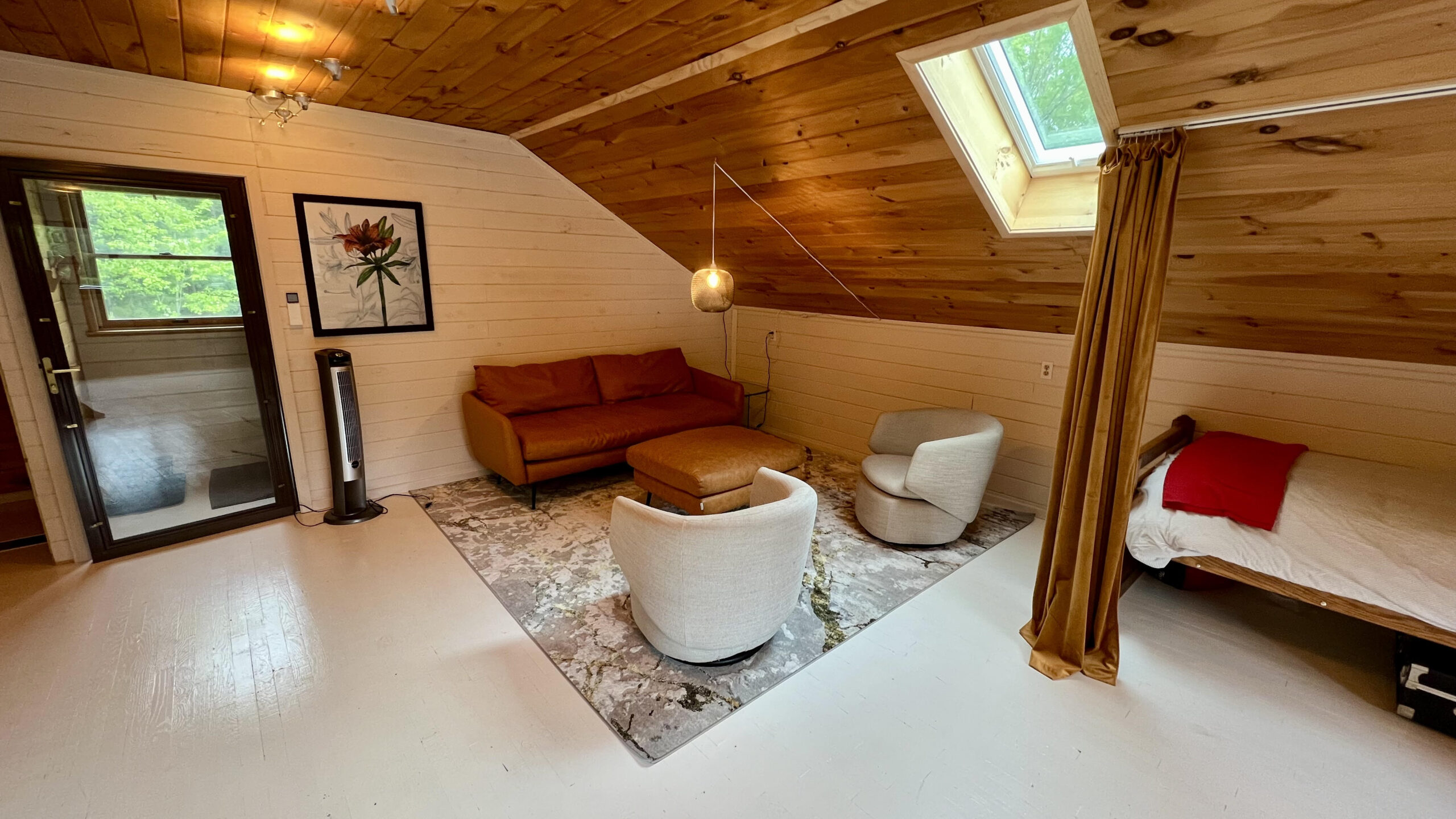 In step Joshua and Tanya in the summer of 2021, who looked past this disrepair and saw a gem needing some TLC and creative attention. Long yearning for a refuge upstate, they educated themselves on all things log cabin (like how to fend off pesky carpenter bees) and dove headfirst into modernization efforts. The two of them took on virtually every aspect of the renovation, including rebuilding the kitchen, adding new flooring and paint, cleaning and weatherproofing the exterior logs, reviving the pool, converting the garage loft into a comfortable bonus space, and installing close to 2,000 sq ft of new Trex decking (+ 2k linear feet of cable rail!). Each decision was consciously made to consider durability, functionality, and sustainability.